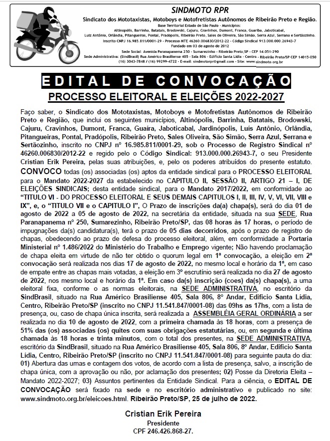 ELEIÇÕES SINDICAIS - SINDMOTO RPR - MANDATO 2022-2027